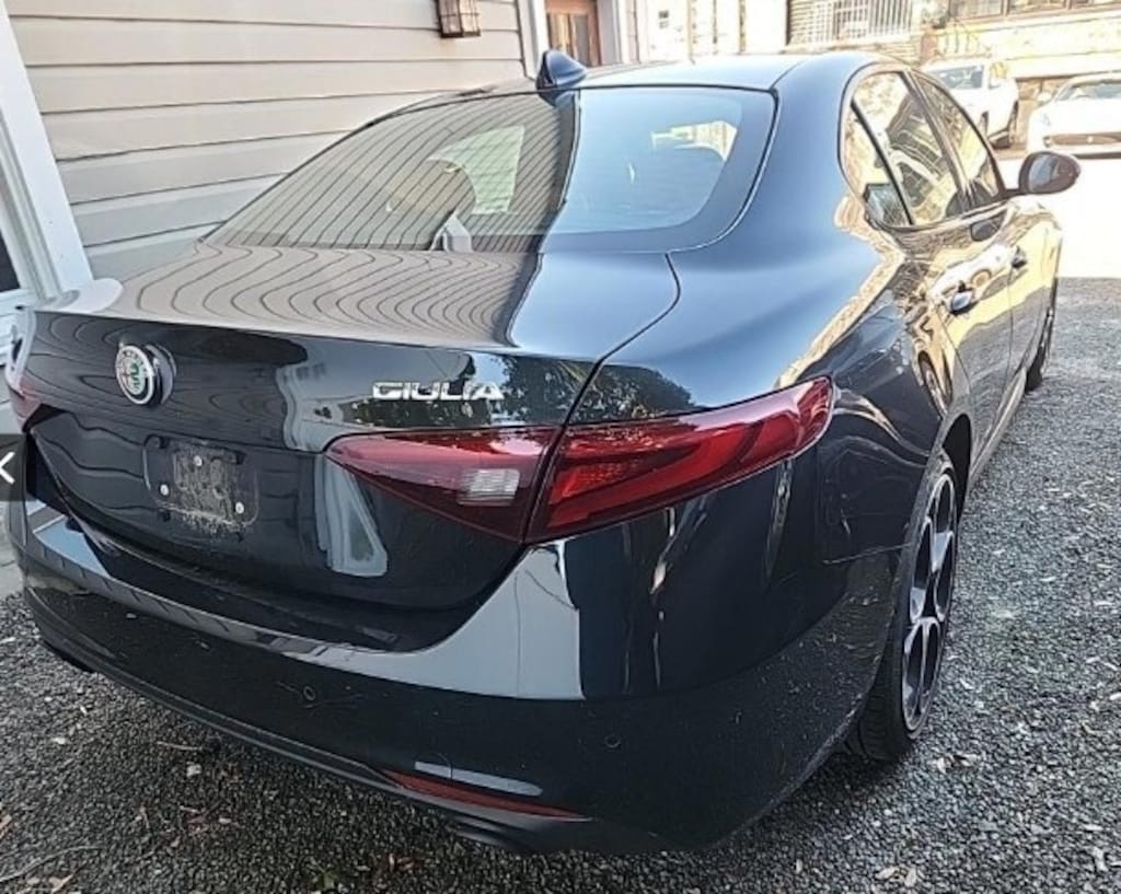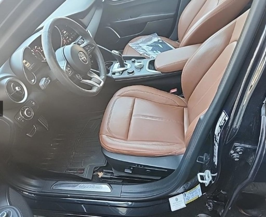 This Giulia is well equipped with Quick Order Package 22G (Silver Ti Badge), Apple CarPlay/Android Auto, Heated front seats, Leather Seats, Navigation System, Power moonroof, Saddle Brown Seats, 4-Wheel Disc Brakes, 8 Speakers, ABS brakes, Air Conditioning, Alloy wheels, AM/FM radio: SiriusXM, Auto High-beam Headlights, Auto-dimming door mirrors, Auto-dimming Rear-View mirror, Automatic temperature control, Brake assist, Bumpers: body-color, Compass, Delay-off headlights, Driver door bin, Driver vanity mirror, Dual front impact airbags, Dual front side impact airbags, Electronic Stability Control, Emergency communication system: SiriusXM Guardian - included trial, Exterior Parking Camera Rear, Four wheel independent suspension, Front anti-roll bar, Front Bucket Seats, Front Center Armrest, Front dual zone A/C, Front reading lights, Fully automatic headlights, Garage door transmitter, Genuine wood console insert, Genuine wood dashboard insert, Genuine wood door panel insert, Gloss Red Calipers w/White Script, Heated door mirrors, Heated rear seats, Heated steering wheel, High intensity discharge headlights: Bi-Xenon, Illuminated entry, Knee airbag, Leather Shift Knob, Leather steering wheel, Low tire pressure warning, Memory seat, Occupant sensing airbag, Outside temperature display, Overhead airbag, Overhead console, Panic alarm, Passenger door bin, Passenger vanity mirror, Power door mirrors, Power driver seat, Power passenger seat, Power steering, Power windows, Radio data system, Radio: AM/FM/HD 8.8" w/Navigation, Rain sensing wipers, Rear anti-roll bar, Rear fog lights, Rear reading lights, Rear seat center armrest, Rear window defroster, Remote keyless entry, Security system, Speed control, Speed-sensing steering, Speed-Sensitive Wipers, Split folding rear seat, Sport steering wheel, Steering wheel mounted audio controls, Tachometer, Telescoping steering wheel, Tilt steering wheel, Traction control, Trip computer, Turn signal indicator mirrors, Variably intermittent wipers, Wheels: 18" x 8.0" Dark Turbine Aluminum, and Wheels: 19" x 8.0" Sport 5-Hole Aluminum.