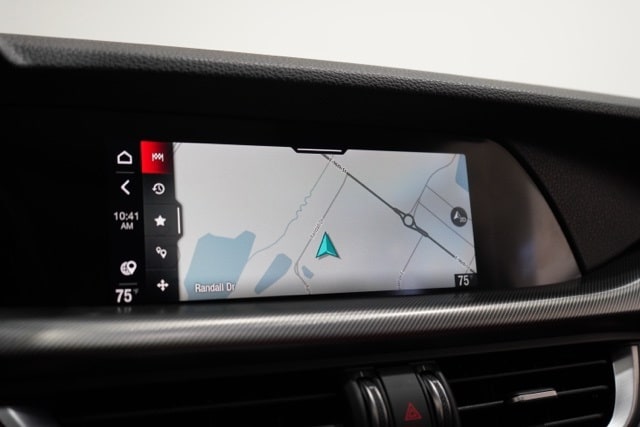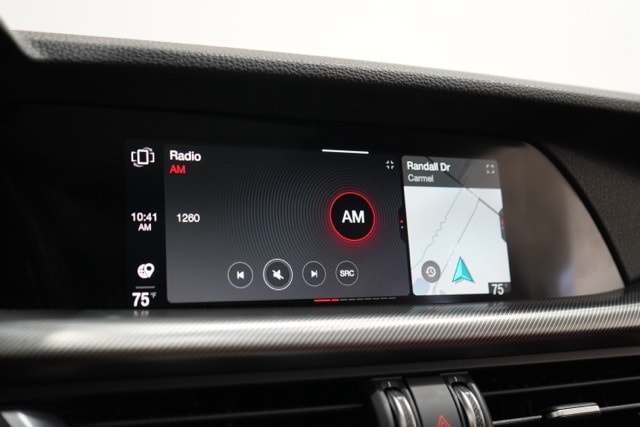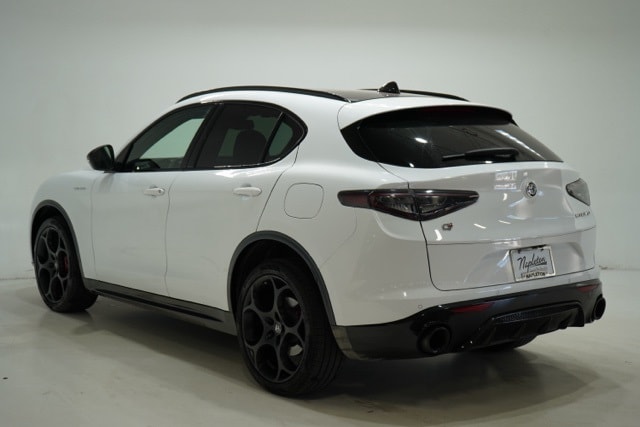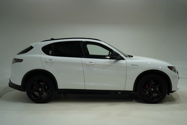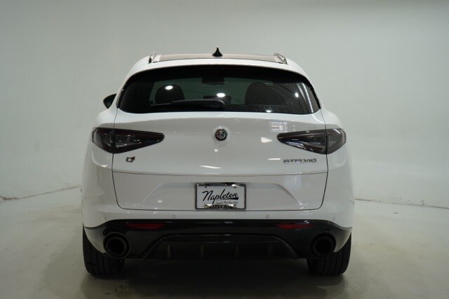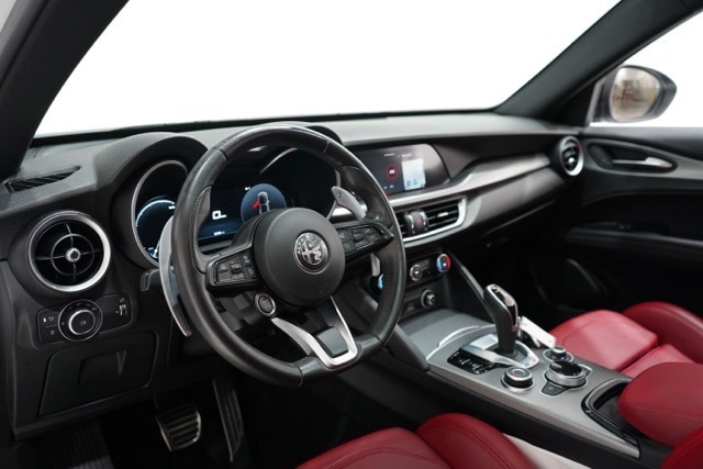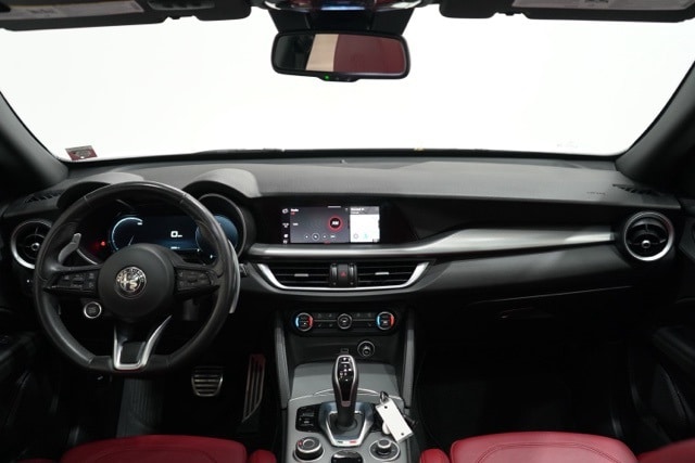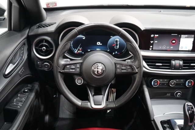 This Stelvio is well equipped with Quick Order Package 22S Veloce (Aluminum Steering Column Mounted Paddle Shifters, Dark Miron V Scudetto Grille, Front Strut Tower Brace, Limited Slip Differential Rear Axle, Power Adjust 8-Way Front Passenger Seat, Power Adjustable Bolster, Sport Leather Seats, Sport Rear Diffuser, Volcano Black Body Kit, and Wheels: 20" x 8.5" Sport 5-Hole Aluminum), Apple CarPlay/Android Auto, Heated front seats, Leather Seats, Power Liftgate, Power moonroof, 3.73 Axle Ratio, 4-Wheel Disc Brakes, 8 Speakers, ABS brakes, Air Conditioning, Alloy wheels, AM/FM radio: SiriusXM, Auto High-beam Headlights, Auto-dimming door mirrors, Auto-dimming Rear-View mirror, Automatic temperature control, Brake assist, Bumpers: body-color, Compass, Delay-off headlights, Driver door bin, Driver vanity mirror, Dual front impact airbags, Dual front side impact airbags, Electronic Stability Control, Emergency communication system: Alfa Connect, Four wheel independent suspension, Front anti-roll bar, Front Bucket Seats, Front Center Armrest, Front dual zone A/C, Front reading lights, Fully automatic headlights, Garage door transmitter, Heated door mirrors, Heated rear seats, Heated steering wheel, High-Intensity Discharge Headlights, Illuminated entry, Knee airbag, Leather Shift Knob, Leather steering wheel, Low tire pressure warning, Memory seat, Navigation System, Occupant sensing airbag, Outside temperature display, Overhead airbag, Overhead console, Panic alarm, ParkView Rear Back-Up Camera, Passenger door bin, Passenger vanity mirror, Power door mirrors, Power driver seat, Power passenger seat, Power steering, Power windows, Radio data system, Radio: AM/FM/HD 8.8" w/Navigation, Rain sensing wipers, Rear anti-roll bar, Rear audio controls, Rear fog lights, Rear reading lights, Rear seat center armrest, Rear window defroster, Rear window wiper, Remote keyless entry, Security system, Speed control, Speed-sensing steering, Speed-Sensitive Wipers, Split folding rear seat, Spoiler, Sport steering wheel, Steering wheel mounted audio controls, Tachometer, Telescoping steering wheel, Tilt steering wheel, Traction control, Trip computer, Turn signal indicator mirrors, Variably intermittent wipers, Wheels: 19" x 8.0" Sport 5-Hole Aluminum, and Wheels: 21" x 8.5" Dark 5-Hole Aluminum.