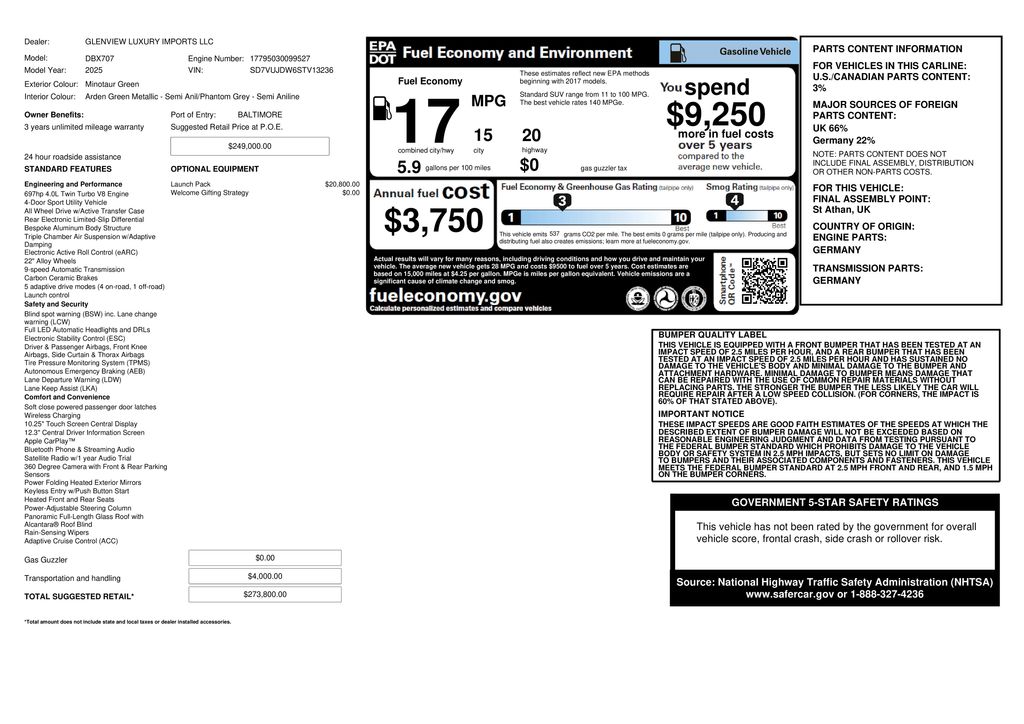 2025 Aston Martin DBX 707 Minotaur Green One Owner Launch Pack