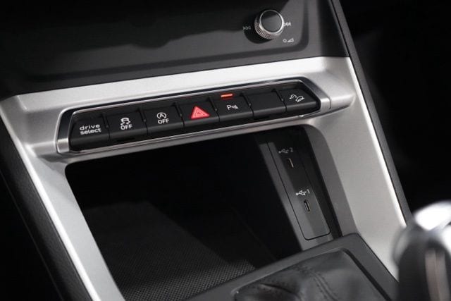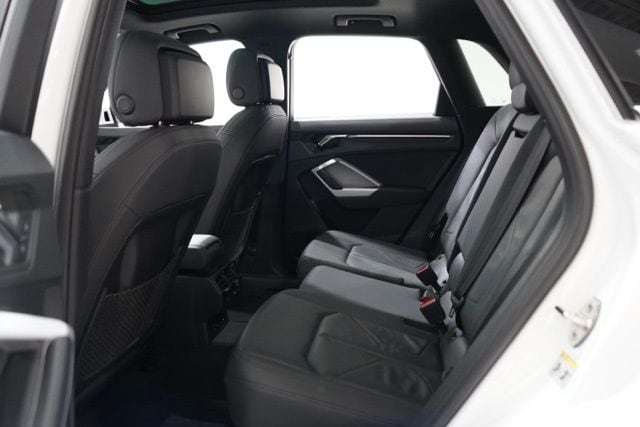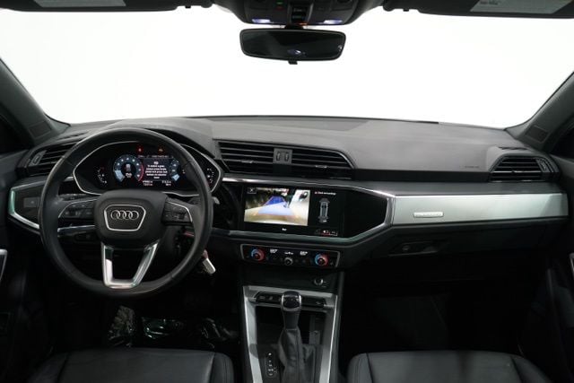 This Q3 is well equipped with 10 Speakers, 3.33 Axle Ratio, 4-Wheel Disc Brakes, ABS brakes, Air Conditioning, Alloy wheels, AM/FM radio, Audi smartphone interface (Apple CarPlay/Android Auto), Auto High-beam Headlights, Automatic temperature control, Brake assist, Bumpers: body-color, Delay-off headlights, Driver door bin, Driver vanity mirror, Dual front impact airbags, Dual front side impact airbags, Electronic Stability Control, Emergency communication system: Audi connect CARE, Exterior Parking Camera Rear, Four wheel independent suspension, Front anti-roll bar, Front Bucket Seats, Front Center Armrest, Front dual zone A/C, Front fog lights, Front reading lights, Fully automatic headlights, Heated door mirrors, Heated Front Bucket Seats, Heated front seats, Illuminated entry, Knee airbag, Leather Seating Surfaces, Leather Shift Knob, Leather steering wheel, Low tire pressure warning, Occupant sensing airbag, Outside temperature display, Overhead airbag, Overhead console, Panic alarm, Passenger door bin, Passenger vanity mirror, Power door mirrors, Power driver seat, Power Liftgate, Power moonroof: Panoramic, Power passenger seat, Power steering, Power windows, Radio data system, Radio: Audi Sound System, Rain sensing wipers, Rear air conditioning, Rear anti-roll bar, Rear fog lights, Rear reading lights, Rear seat center armrest, Rear window defroster, Rear window wiper, Remote keyless entry, Speed control, Speed-sensing steering, Split folding rear seat, Spoiler, Steering wheel mounted audio controls, Tachometer, Telescoping steering wheel, Tilt steering wheel, Traction control, Trip computer, Turn signal indicator mirrors, Variably intermittent wipers, and Wheels: 18" 5-Y-Spoke Design.