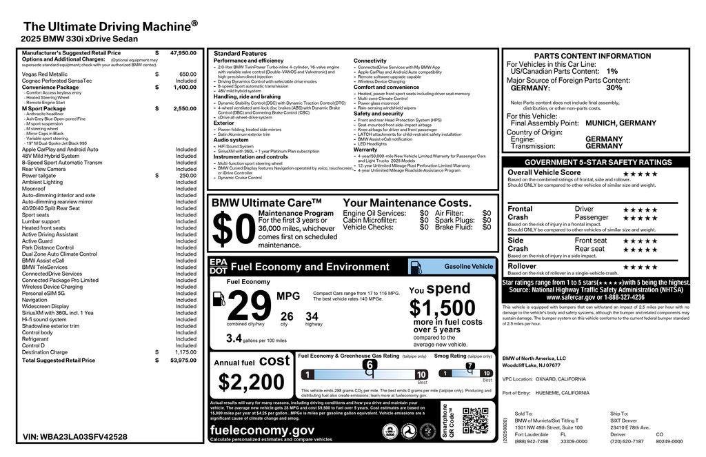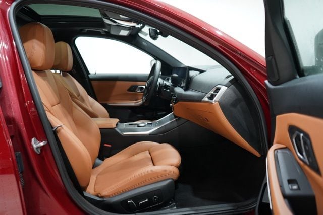 This 3 Series is well equipped with Connected Package Pro, Convenience Package (Active Blind Spot Detection, Active Driving Assistant, Comfort Access Keyless Entry, Frontal Collision Warning, Heated Steering Wheel, Lane Departure Warning System, Park Distance Control, and Remote Engine Start), M Sport Package, AWD, 10 Speakers, 4-Wheel Disc Brakes, ABS brakes, Aerodynamic Kit, Air Conditioning, Alloy wheels, AM/FM radio: SiriusXM, Apple CarPlay and Android Auto Compatibility, Auto High-beam Headlights, Auto-dimming door mirrors, Auto-dimming Rear-View mirror, Automatic temperature control, Black Mirror Caps, BMW Assist ECall, BMW TeleServices, Brake assist, Bumpers: body-color, Compass, ConnectedDrive Services, Delay-off headlights, Driver door bin, Driver vanity mirror, Dual front impact airbags, Dual front side impact airbags, Electronic Stability Control, Emergency communication system: BMW Assist eCall, Exterior Parking Camera Rear, Four wheel independent suspension, Front anti-roll bar, Front Bucket Seats, Front Center Armrest, Front dual zone A/C, Front reading lights, Fully automatic headlights, Garage door transmitter, Genuine wood console insert, Genuine wood dashboard insert, Heated door mirrors, Heated Front Seats, Heated front seats, Hi-Fi Sound System, Illuminated entry, Knee airbag, Leather steering wheel, Low tire pressure warning, Lumbar Support, M Sport Suspension, M Steering Wheel, Memory seat, Navigation, Navigation System, Occupant sensing airbag, Outside temperature display, Overhead airbag, Panic alarm, Passenger door bin, Passenger vanity mirror, Perforated Sensatec Upholstery, Personal ESIM 5G, Power door mirrors, Power driver seat, Power Front Seats, Power moonroof, Power passenger seat, Power steering, Power Tailgate, Power windows, Radio data system, Radio: AM/FM Audio System, Rain sensing wipers, Rear air conditioning, Rear anti-roll bar, Rear reading lights, Rear seat center armrest, Rear Spoiler, Rear window defroster, Remote keyless entry, Security system, Shadowline Exterior Trim, SiriusXM Satellite Radio with 1 Year Subscription, Speed control, Speed-sensing steering, Speed-Sensitive Wipers, Split folding rear seat, Sport Seats, Sport steering wheel, Steering wheel mounted audio controls, Tachometer, Telescoping steering wheel, Tilt steering wheel, Traction control, Trip computer, Turn signal indicator mirrors, Variable Sport Steering, Variably intermittent wipers, Wheels: 18" x 7.5" Dual-Spoke Silver, Wheels: 19" x 8" M Dual-Spoke Bicolor, Wheels: 19" x 8" M Dual-Spoke Jet Black, Widescreen Display, Wireless Device Charging, and Without Lines Designation Outside.