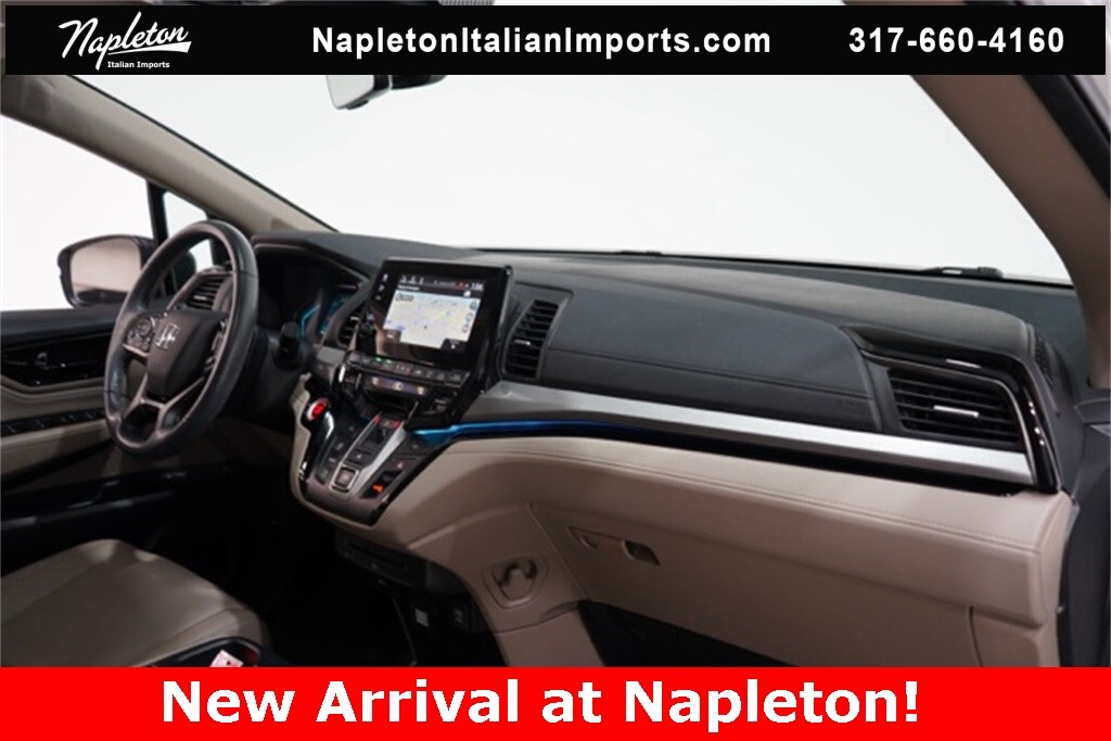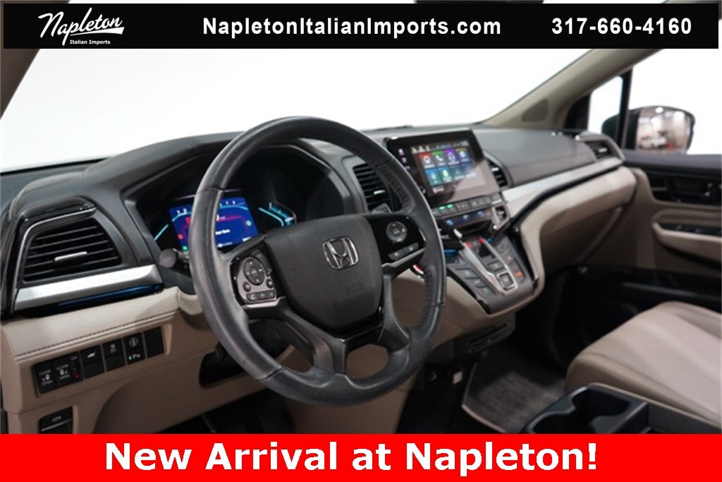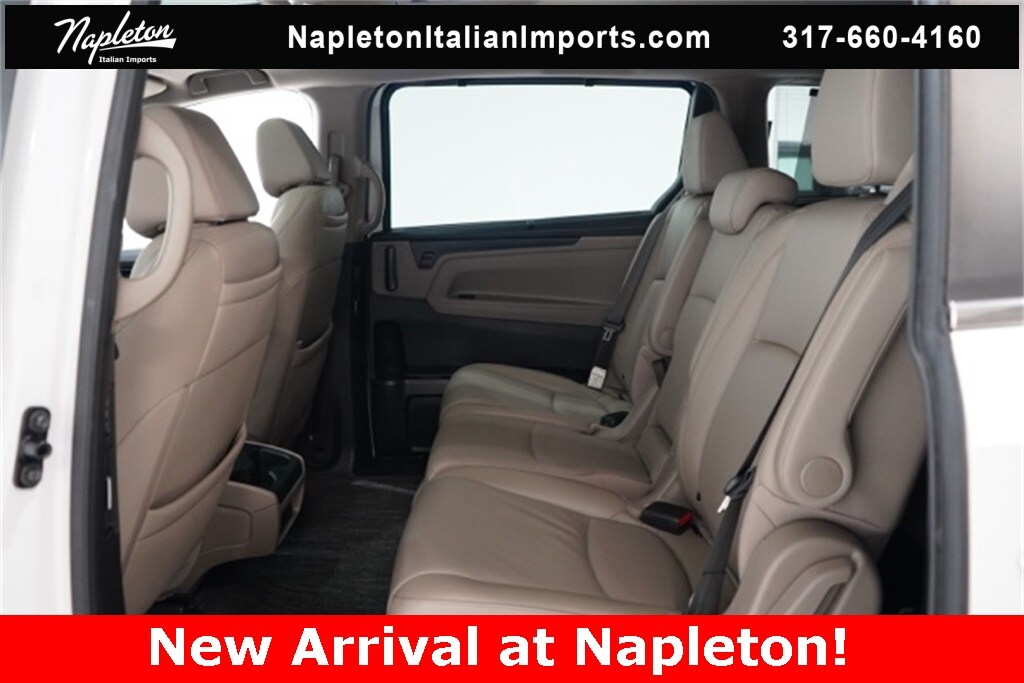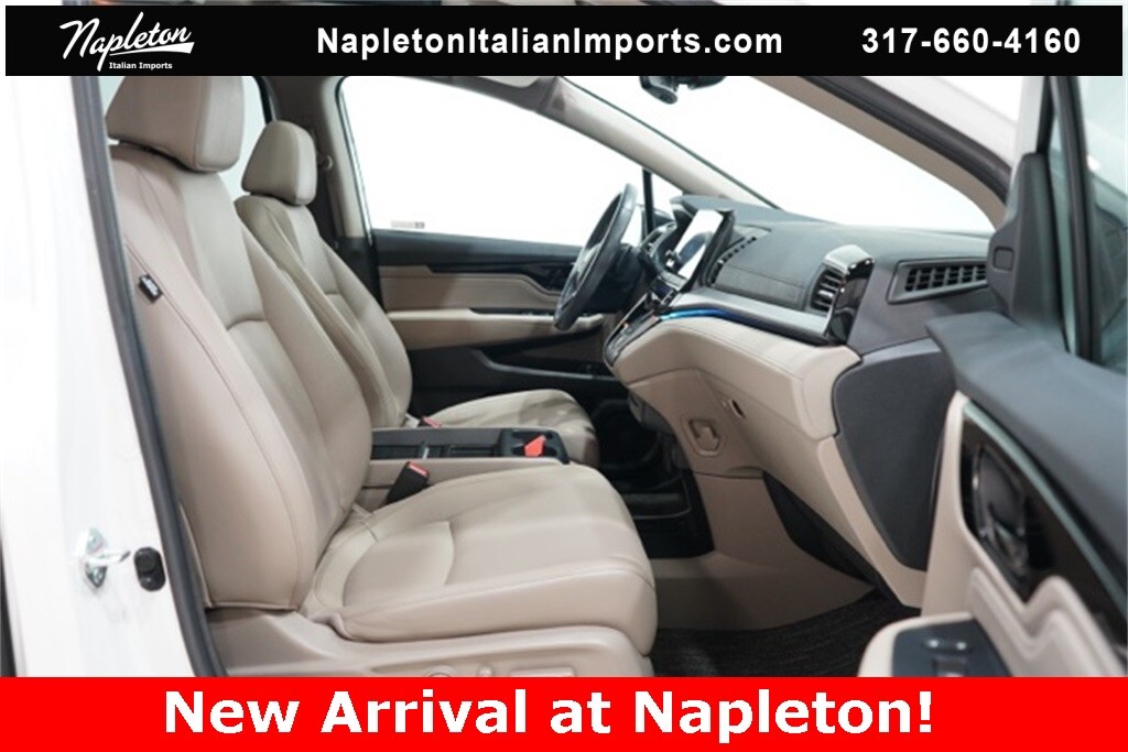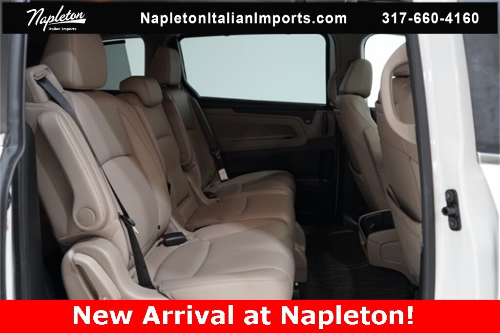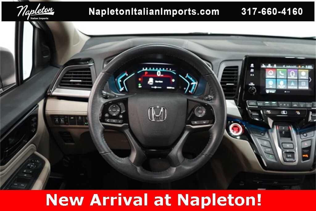 This Odyssey is well equipped with Apple CarPlay/Android Auto, Blind Spot Information (BSI) System warning, Heated front seats, Lane departure: Lane Keeping Assist System (LKAS) active, Navigation system: Honda Satellite-Linked Navigation System, Power Liftgate, Power moonroof, Reclining 3rd row seat, 3.61 Axle Ratio, 3rd row seats: split-bench, 4-Wheel Disc Brakes, 7 Speakers, A/V remote: CabinControl, ABS brakes, Adaptive Cruise Control: Adaptive Cruise Control (ACC) with Low-Speed Follow, Air Conditioning, Alloy wheels, AM/FM radio: SiriusXM, Anti-whiplash front head restraints, Auto High-beam Headlights, Auto-dimming Rear-View mirror, Automatic temperature control, Brake assist, Bumpers: body-color, CD player, Compass, Delay-off headlights, Driver door bin, Driver vanity mirror, Driver's Seat Mounted Armrest, Dual front impact airbags, Dual front side impact airbags, DVD-Audio, Electronic Stability Control, Emergency communication system: HondaLink, Exterior Parking Camera Rear, Four wheel independent suspension, Front anti-roll bar, Front Bucket Seats, Front dual zone A/C, Front fog lights, Front reading lights, Fully automatic headlights, Garage door transmitter: HomeLink, Headphones, Heated door mirrors, Heated Front Bucket Seats, Illuminated entry, Knee airbag, Leather Seat Trim, Leather steering wheel, Low tire pressure warning, Memory seat, Occupant sensing airbag, Outside temperature display, Overhead airbag, Overhead console, Panic alarm, Passenger door bin, Passenger seat mounted armrest, Passenger vanity mirror, Power door mirrors, Power driver seat, Power passenger seat, Power steering, Power windows, Radio data system, Radio: 160-Watt AM/FM/HD/SiriusXM Audio System, Rear air conditioning, Rear anti-roll bar, Rear audio controls, Rear reading lights, Rear seat center armrest, Rear window defroster, Rear window wiper, Remote keyless entry, Security system, Speed control, Speed-sensing steering, Speed-Sensitive Wipers, Split folding rear seat, Spoiler, Steering wheel mounted audio controls, Tachometer, Telescoping steering wheel, Tilt steering wheel, Traction control, Trip computer, Turn signal indicator mirrors, Variably intermittent wipers, and Wheels: 19" Machine-Finished Alloy.