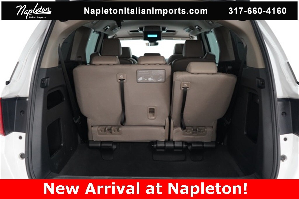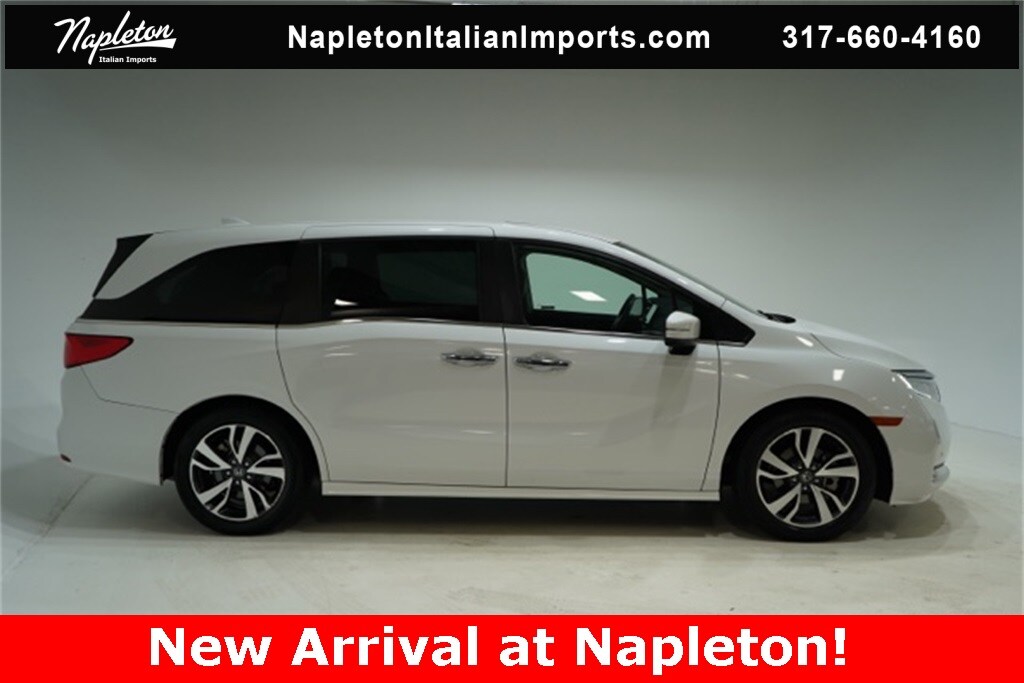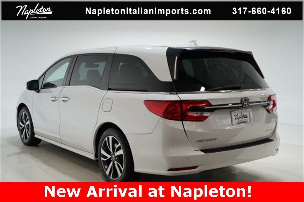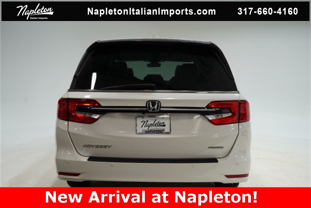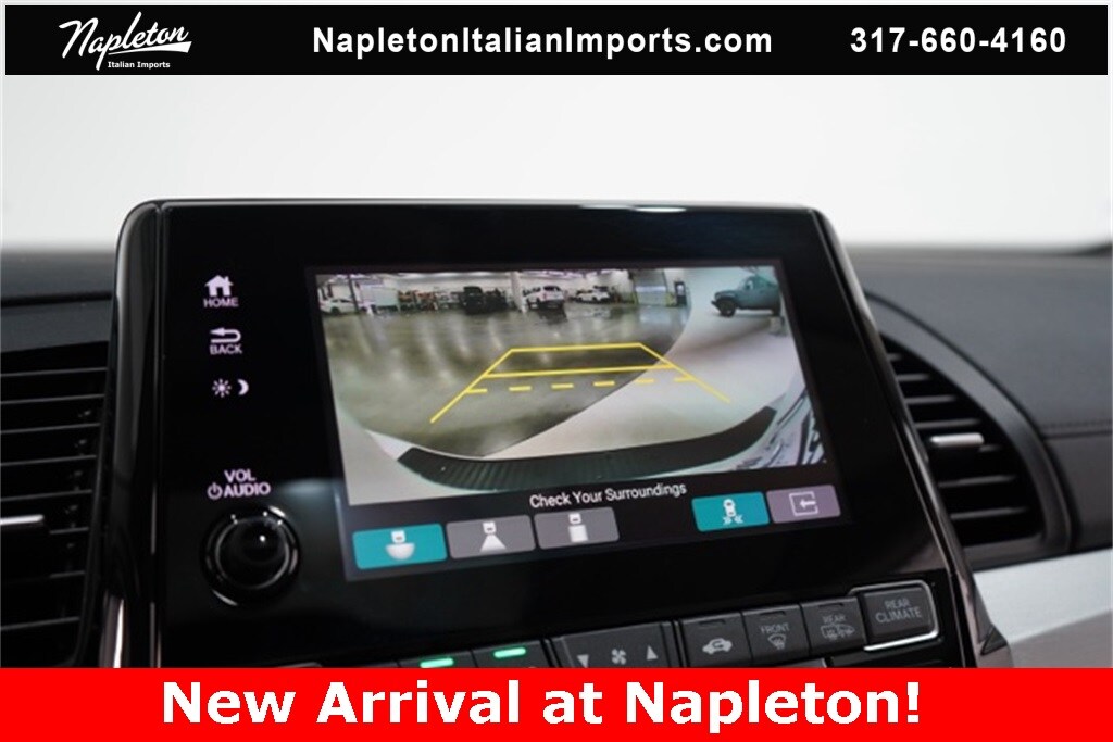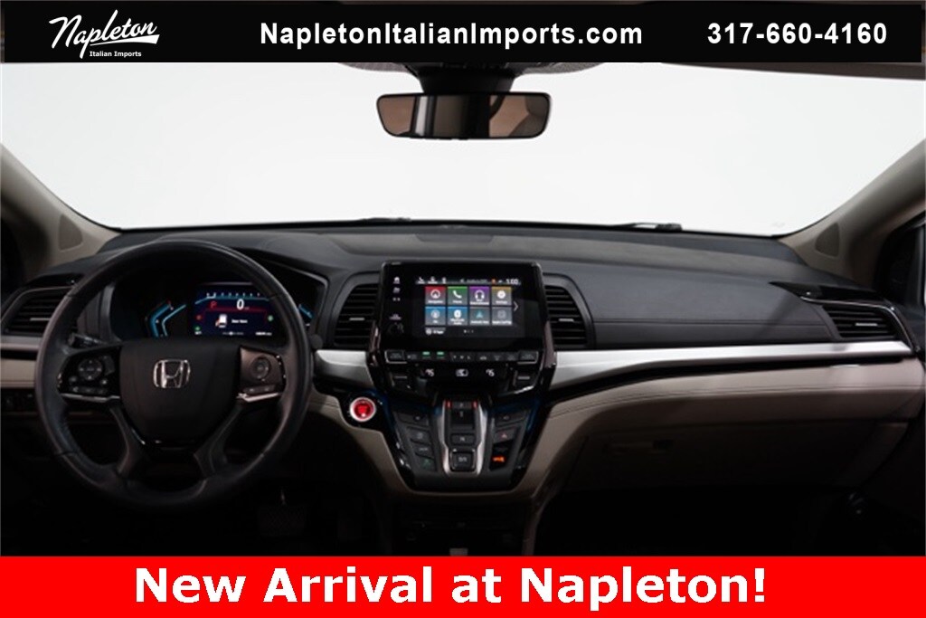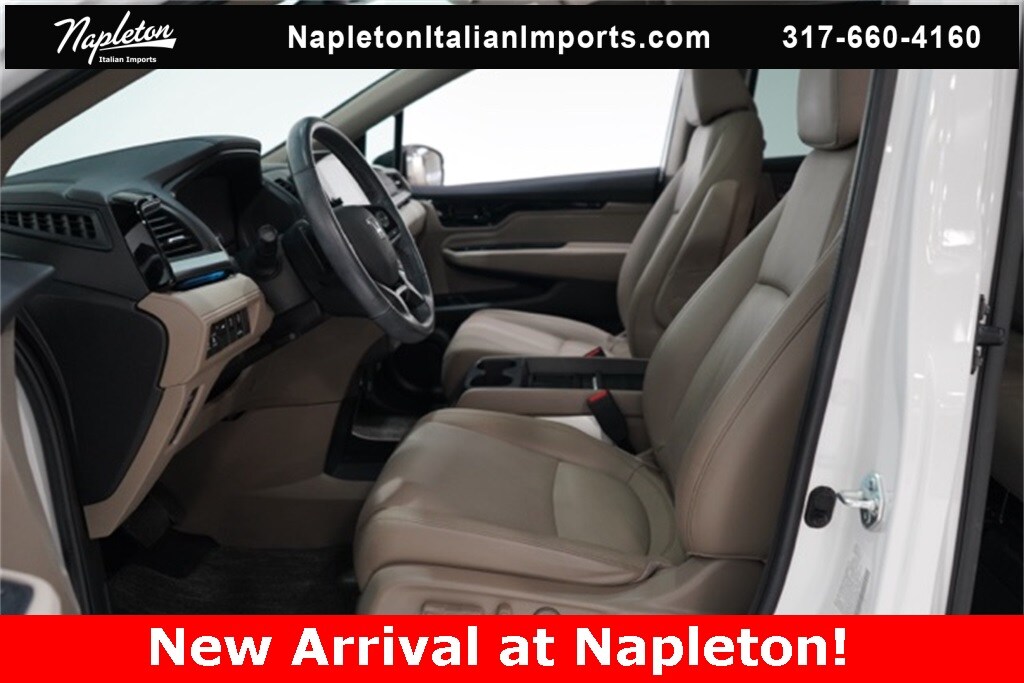This Odyssey is well equipped with Apple CarPlay/Android Auto, Blind Spot Information (BSI) System warning, Heated front seats, Lane departure: Lane Keeping Assist System (LKAS) active, Navigation system: Honda Satellite-Linked Navigation System, Power Liftgate, Power moonroof, Reclining 3rd row seat, 3.61 Axle Ratio, 3rd row seats: split-bench, 4-Wheel Disc Brakes, 7 Speakers, A/V remote: CabinControl, ABS brakes, Adaptive Cruise Control: Adaptive Cruise Control (ACC) with Low-Speed Follow, Air Conditioning, Alloy wheels, AM/FM radio: SiriusXM, Anti-whiplash front head restraints, Auto High-beam Headlights, Auto-dimming Rear-View mirror, Automatic temperature control, Brake assist, Bumpers: body-color, CD player, Compass, Delay-off headlights, Driver door bin, Driver vanity mirror, Driver's Seat Mounted Armrest, Dual front impact airbags, Dual front side impact airbags, DVD-Audio, Electronic Stability Control, Emergency communication system: HondaLink, Exterior Parking Camera Rear, Four wheel independent suspension, Front anti-roll bar, Front Bucket Seats, Front dual zone A/C, Front fog lights, Front reading lights, Fully automatic headlights, Garage door transmitter: HomeLink, Headphones, Heated door mirrors, Heated Front Bucket Seats, Illuminated entry, Knee airbag, Leather Seat Trim, Leather steering wheel, Low tire pressure warning, Memory seat, Occupant sensing airbag, Outside temperature display, Overhead airbag, Overhead console, Panic alarm, Passenger door bin, Passenger seat mounted armrest, Passenger vanity mirror, Power door mirrors, Power driver seat, Power passenger seat, Power steering, Power windows, Radio data system, Radio: 160-Watt AM/FM/HD/SiriusXM Audio System, Rear air conditioning, Rear anti-roll bar, Rear audio controls, Rear reading lights, Rear seat center armrest, Rear window defroster, Rear window wiper, Remote keyless entry, Security system, Speed control, Speed-sensing steering, Speed-Sensitive Wipers, Split folding rear seat, Spoiler, Steering wheel mounted audio controls, Tachometer, Telescoping steering wheel, Tilt steering wheel, Traction control, Trip computer, Turn signal indicator mirrors, Variably intermittent wipers, and Wheels: 19" Machine-Finished Alloy.