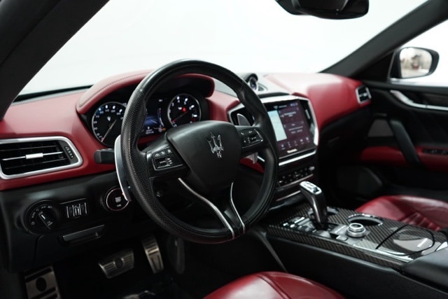 This Ghibli is well equipped with Navigation System, 10 Speakers, 12-Way Power Heated Front Sport Seats, 4-Wheel Disc Brakes, ABS brakes, Adaptive suspension, Air Conditioning, Alloy wheels, Aluminum Column-Mounted Paddle Shifters, AM/FM radio: SiriusXM, Anti-whiplash front head restraints, Apple CarPlay/Android Auto, Auto High-beam Headlights, Auto-dimming door mirrors, Auto-dimming Rear-View mirror, Automatic temperature control, Brake assist, Bumpers: body-color, Compass, Delay-off headlights, Door auto-latch, Driver door bin, Driver vanity mirror, Dual front impact airbags, Dual front side impact airbags, Electronic Stability Control, Emergency communication system: Maserati Connect, Exterior Parking Camera Rear, Four wheel independent suspension, Front anti-roll bar, Front Bucket Seats, Front Center Armrest w/Storage, Front dual zone A/C, Front reading lights, Garage door transmitter: HomeLink, harman/kardon® Speakers, harmon/kardon 900 Watts Premium Audio System, Heated door mirrors, Heated front seats, Heated steering wheel, Illuminated entry, Knee airbag, Leather Shift Knob, Leather steering wheel, Low tire pressure warning, Memory seat, Occupant sensing airbag, Outside temperature display, Overhead airbag, Overhead console, Panic alarm, Passenger door bin, Passenger vanity mirror, Pieno Fiore Natural Leather Upholstery, Power door mirrors, Power driver seat, Power moonroof, Power passenger seat, Power steering, Power windows, Radio data system, Radio: AM/FM w/Maserati Intelligent Assistant, Rain sensing wipers, Rear anti-roll bar, Rear fog lights, Rear reading lights, Rear seat center armrest, Rear window defroster, Remote keyless entry, Security system, Speed control, Speed-sensing steering, Speed-Sensitive Wipers, Split folding rear seat, Sport steering wheel, Steering wheel memory, Steering wheel mounted audio controls, Tachometer, Telescoping steering wheel, Tilt steering wheel, Traction control, Trip computer, Trofeo Logo Stitched in Front & Rear Headrests, Turn signal indicator mirrors, Variably intermittent wipers, Ventilated Front Seats, Ventilated front seats, Voltmeter, and Wheels: 21" Orione Forged Polished Black.