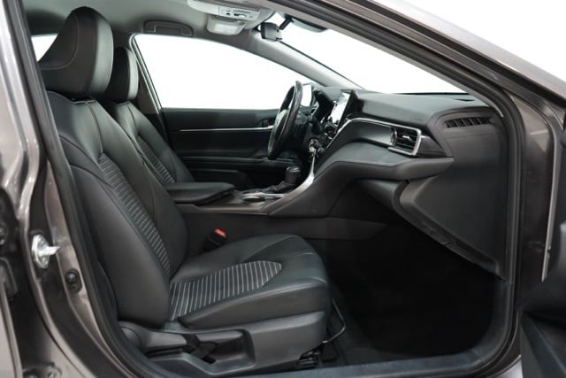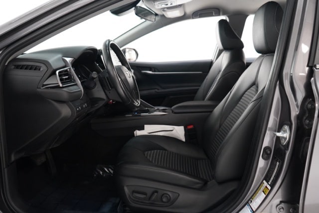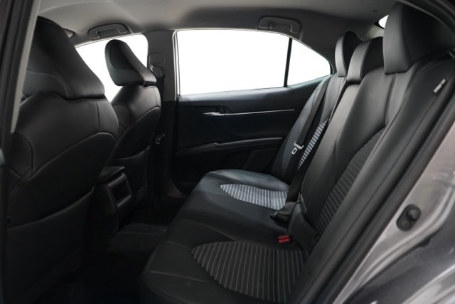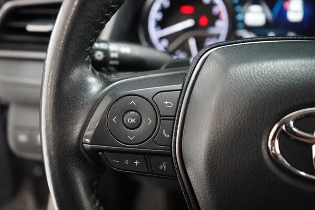 This Camry is well equipped with Black Artificial Leather, ABS brakes, Active Cruise Control, Alloy wheels, Electronic Stability Control, Front dual zone A/C, Heated door mirrors, Illuminated entry, Low tire pressure warning, Remote keyless entry, Traction control, 4-Wheel Disc Brakes, 6 Speakers, 8.0J x 18" Alloy Wheels, Air Conditioning, AM/FM radio: SiriusXM, Apple CarPlay/Android Auto, Auto High-beam Headlights, Automatic temperature control, Brake assist, Bumpers: body-color, Delay-off headlights, Driver door bin, Driver vanity mirror, Dual front impact airbags, Dual front side impact airbags, Emergency communication system: Safety Connect (1-year trial), Exterior Parking Camera Rear, Four wheel independent suspension, Front anti-roll bar, Front Bucket Seats, Front Center Armrest, Front reading lights, Fully automatic headlights, Knee airbag, Leather steering wheel, Occupant sensing airbag, Outside temperature display, Overhead airbag, Overhead console, Panic alarm, Passenger door bin, Passenger vanity mirror, Power door mirrors, Power driver seat, Power steering, Power windows, Radio data system, Radio: Audio, Rear anti-roll bar, Rear seat center armrest, Rear side impact airbag, Rear window defroster, Security system, Speed control, Speed-sensing steering, Split folding rear seat, Spoiler, Sport SofTex Seat Trim w/Fabric Inserts, Steering wheel mounted audio controls, Tachometer, Telescoping steering wheel, Tilt steering wheel, Trip computer, Turn signal indicator mirrors, and Variably intermittent wipers.